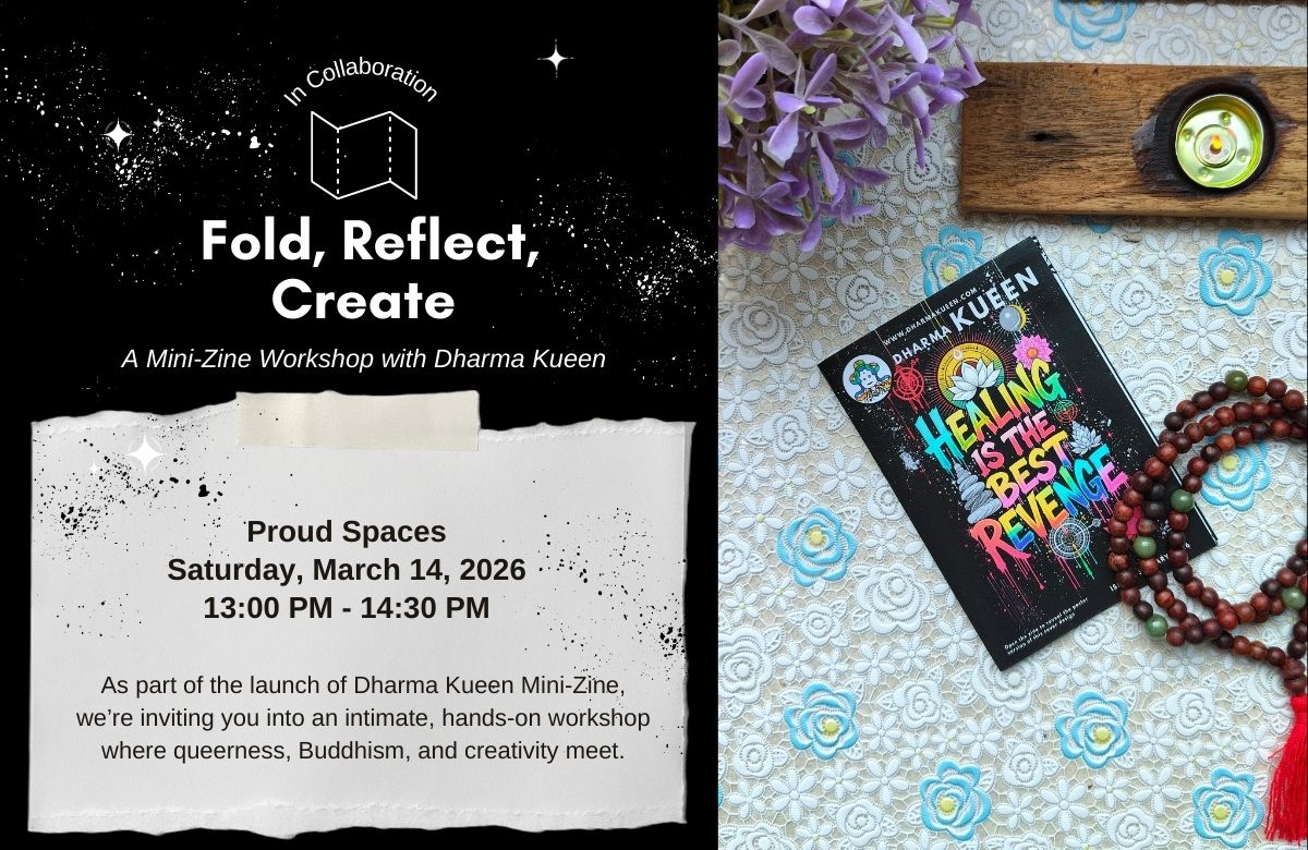 You’ll learn how the mini-zine was made, do some of the reflection exercises together, and create two Dharma Kueen mini-zines on the spot. This is a space for queerness, healing, humor, and mindfulness to sit side by side.